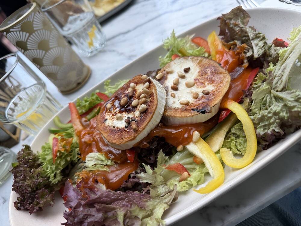 ’s Middags neemt mijn collega me mee uit lunchen. Ik ga voor deze geitenkaas salade en hij is echt waanzinnig.