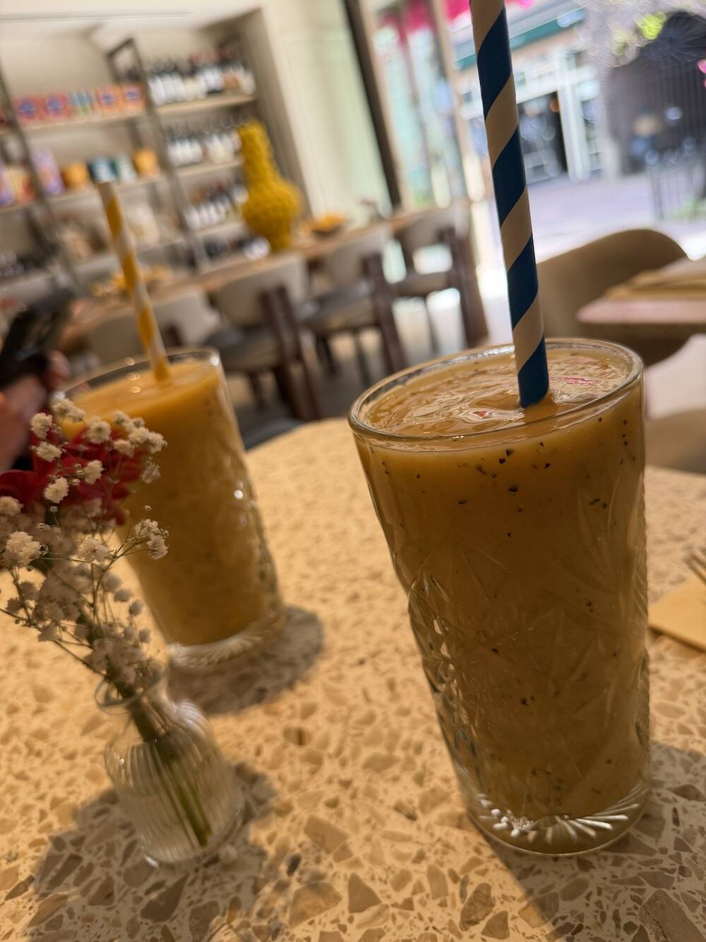 Ik maak een tussenstop op kantoor en mijn collega neemt me weer mee uit lunchen. Hij heeft niks goed te maken voor de rest hoor, haha. We zijn altijd lekker eensgezind: eerst een smoothie met passievrucht en perzik.