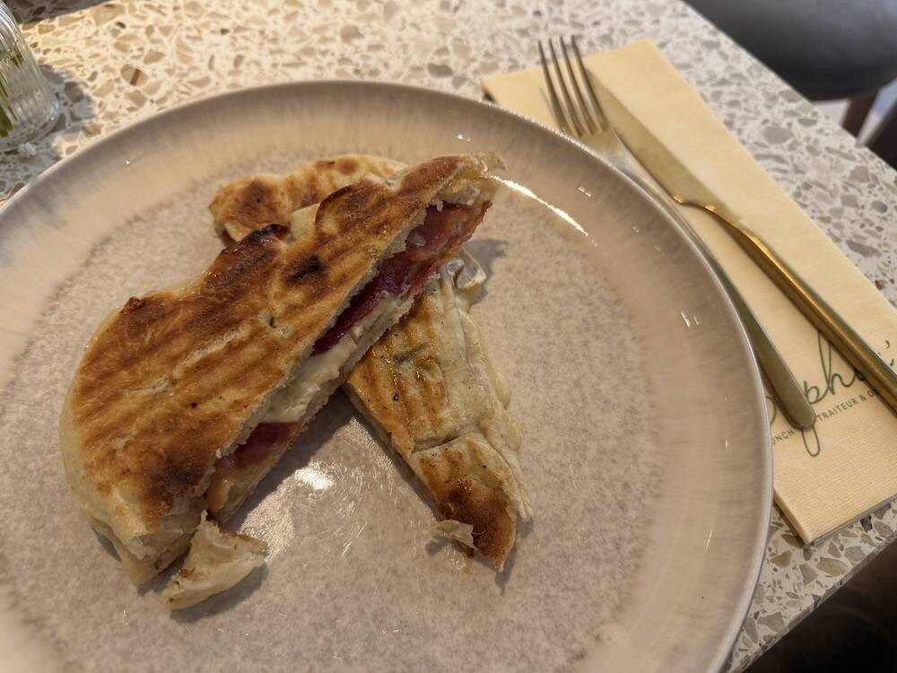 Een panini met brie, bacon en honing. Mjam.