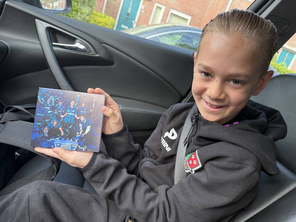 De nieuwe cd van Flemming is uit en als verrassing had ik hem voor Maddox besteld. Ik heb nog een oude cd-speler in de auto, dus we kunnen het steeds luisteren als we naar voetbal gaan. We kregen er ook een fotokaart met handtekening bij dus hij is helemaal in zijn element.