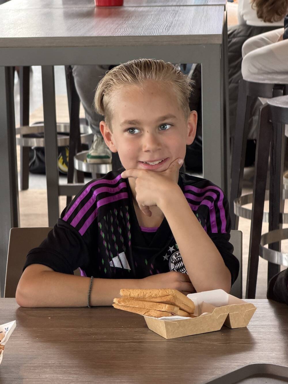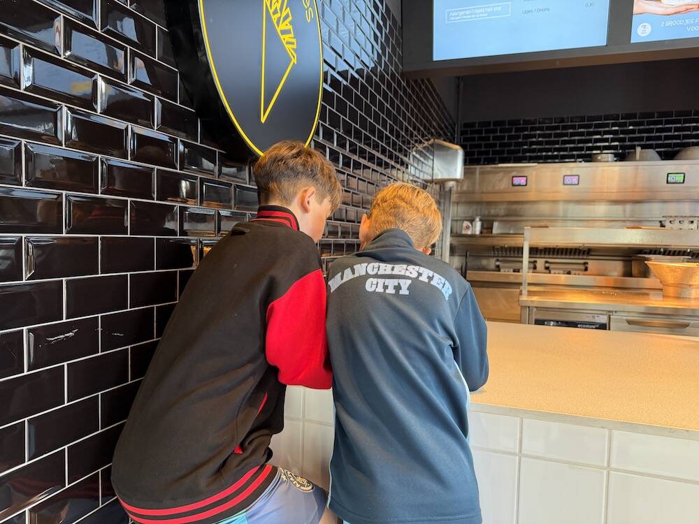 Tijd voor patat. Raymond en ik eten thuis, maar bij de jongens moet er echt voedsel in.