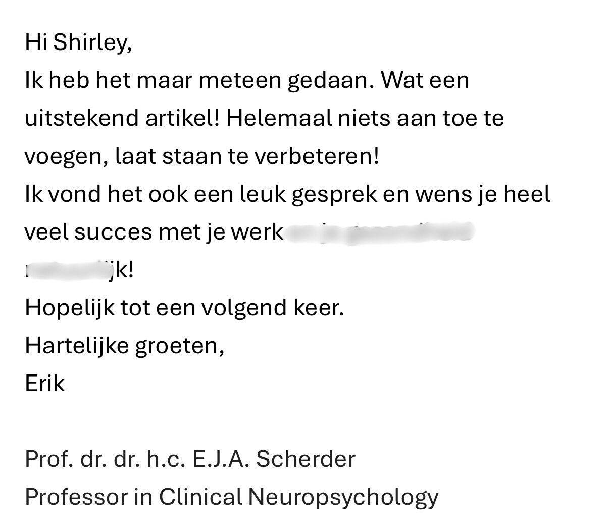 Ik kom thuis met dit bericht en dit betekent alles voor me. Ik heb er heel hard aan gewerkt, maar ik twijfel tot de dag van vandaag aan mijn kunnen. Ben altijd bang dat ik het niet goed doe en als ik mails moet openen voor goedkeuring, ben ik altijd bang dat ik dingen niet goed heb gedaan en te horen krijg dat ik het opnieuw moet doen of dat er echt grote fouten in staan. Dat de hoogleraar zelf dit zo naar me toestuurt, vind ik echt heel bijzonder. Ik ben er trots op, dat ik dit heb gedaan. En ga dit bericht goed bewaren. Dit is het mooiste compliment over mijn werk dat ik ooit heb gekregen.