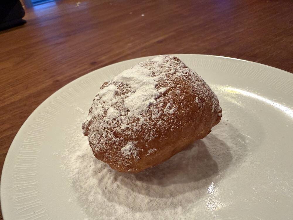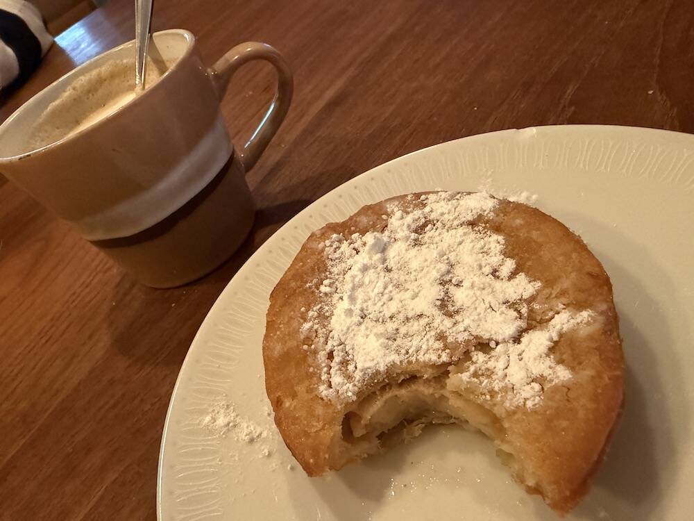 Ontbijten met een appelbeignet. Ook dat hoort erbij.