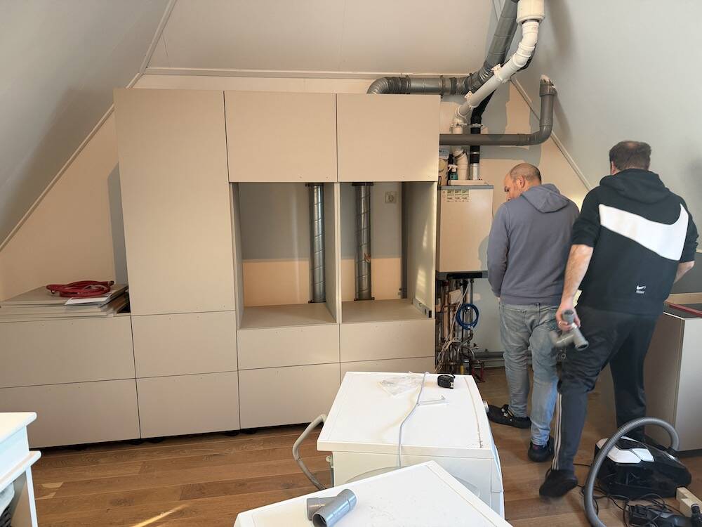 Terwijl de vaders druk bezig zijn met de kast op zolder. Eindelijk staat-ie dan bijna en eindelijk kan die zooi eens fatsoenlijk opgeruimd worden.