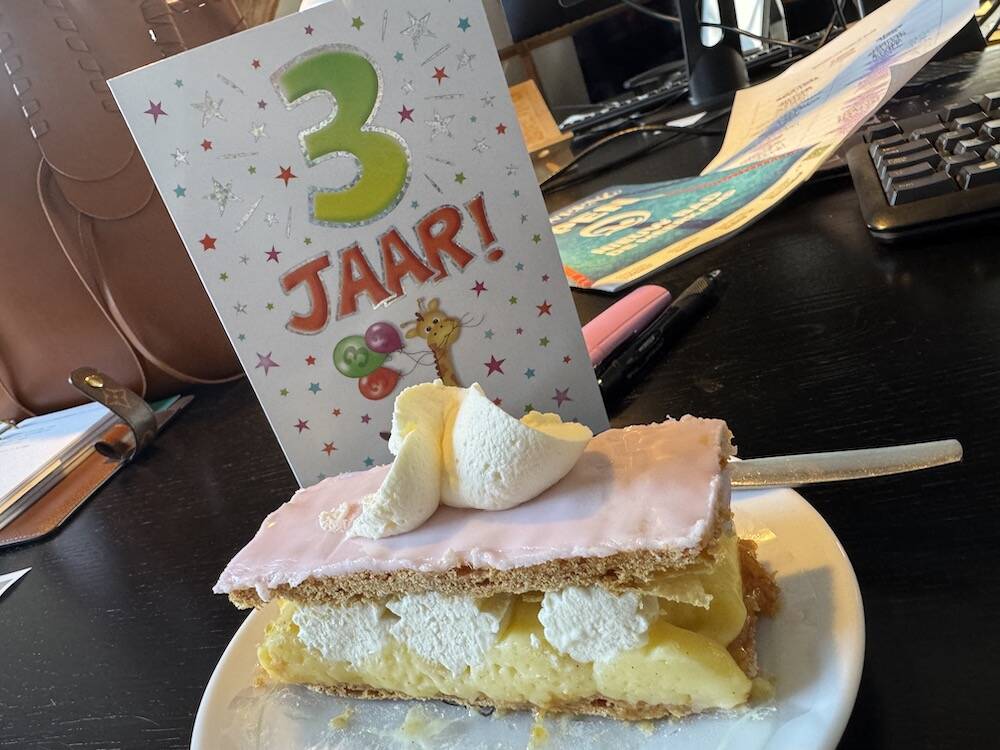 Ik ben drie jaar in dienst! Mijn collega weet hoe hij me blij kan maken. Het kaartje is weer onze heerlijke humor.
