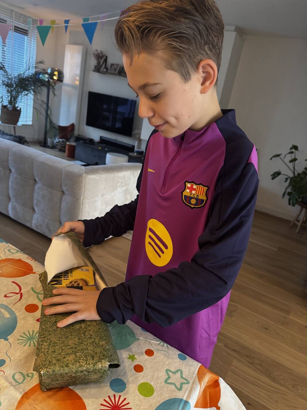 ’s Middags vieren we Skylers verjaardag. Van ons krijgt hij het trainingspak van FC Barcelona, en ik verras hem ook nog eens met kaartjes voor Suzan en Freek. Dat is onze traditie en hij is dolgelukkig dat het gelukt is om kaarten te kopen (ik zei van niet, om de verrassing groot te houden). Voor de rest wordt hij enorm verwend met Playstation kaarten, geld, een mooie hoodie van LA Lakers, snoep, een Ajax trainingspak dat hij laatst al met opa uitzocht bij de Ajax Shop en…