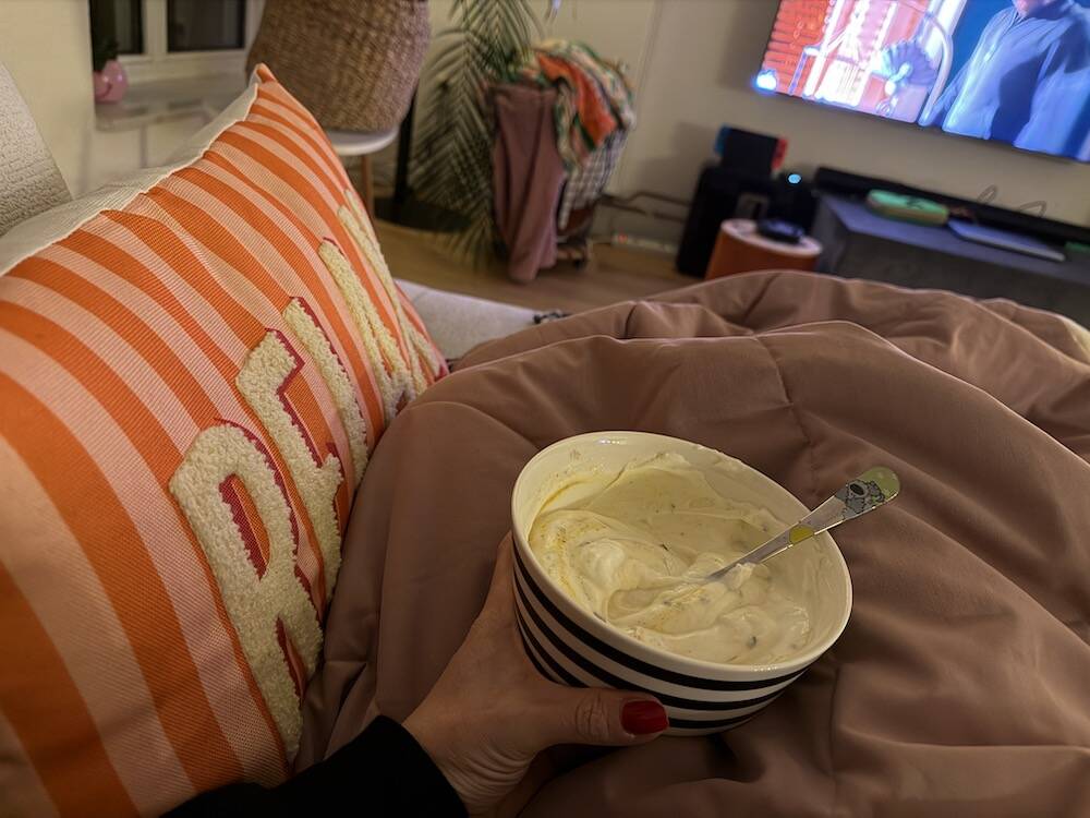 De groene smoothie ’s ochtends zit in mijn systeem; het is nu tijd voor een volgende gezonde gewoonte om meer te eten. Kwark ’s avonds op de bank! Dit is gewoon magere kwark met flavour poeder van ESN. Routine en voorspelbaarheid is voor nu even het makkelijkste voor me.