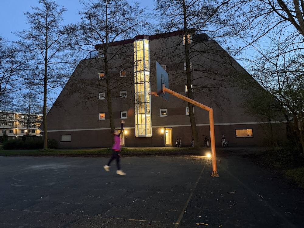 Skyler gaat ’s avonds basketballen met een groepje. Lampen aan en dribbelen maar.