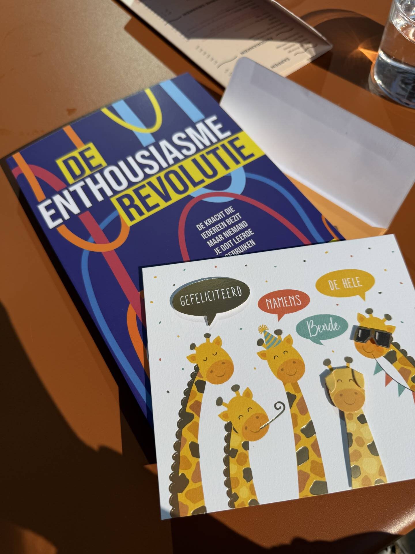 Ik krijg ook nog eens een lief kaartje én een superleuk boek. We zitten heerlijk even in de zon en daarna gaan we weer naar de mannen.
