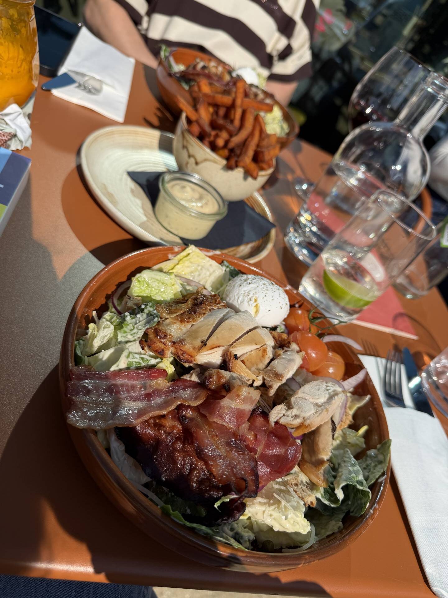 We gaan allebei voor deze Caesar salade, en natuurlijk nemen we daar zoete aardappelfriet bij. Het is wel flink veel, dus het is zo’n beetje lunch en diner in één, lol.