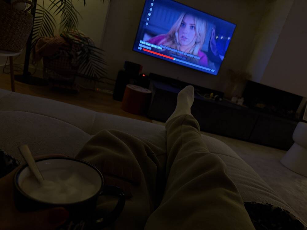 Niemand mag nog tegen me praten, haha. Joggingpak, koffie en helemaal afgedraaid.