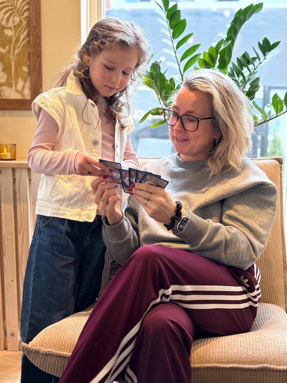 Aandachtig met de Pokémon kaarten in de weer.