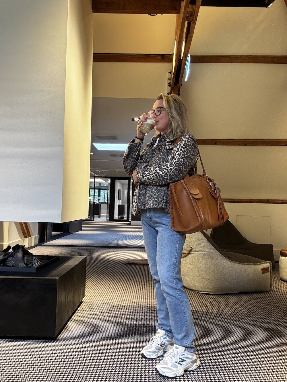 Broek, shirt en jasje Yaya, schoenen New Balance, tas Chloé.