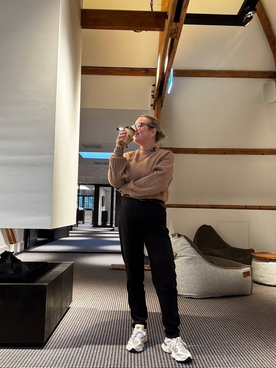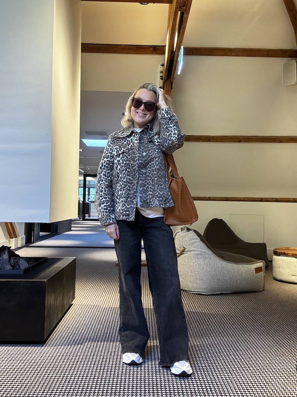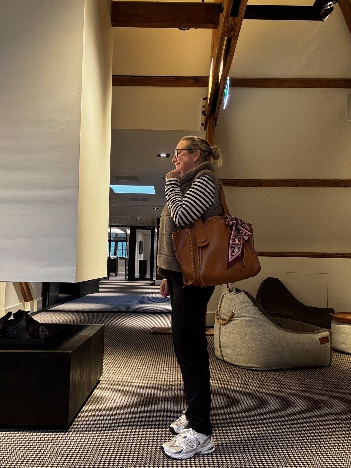 Jeans Lee, trui en gilet Yaya, schoenen Nike, riem Mango, tas Chloé.